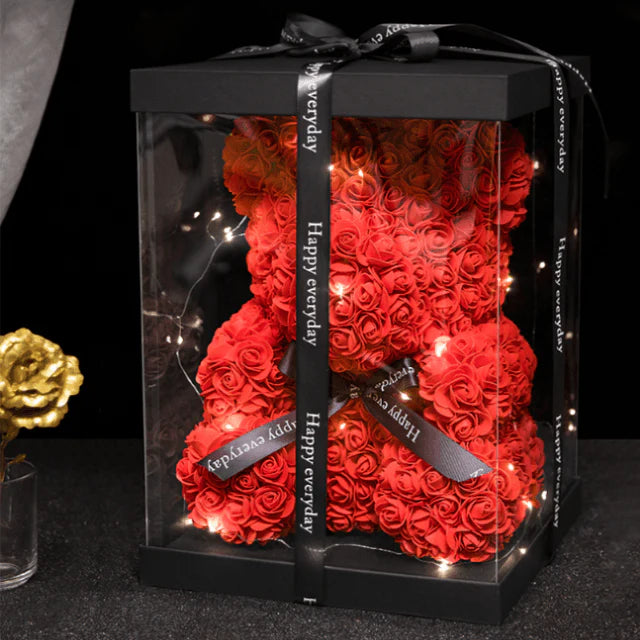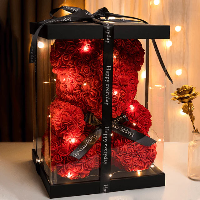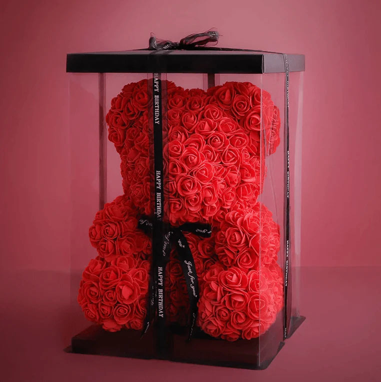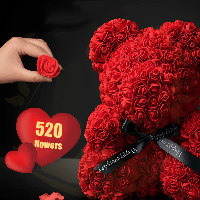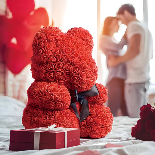 Dekorativni medvedić izrađen od veštačkih ruža, savršen kao poklon koji simbolizuje trajnu ljubav i pažnju. Svaka ruža je ručno postavljena, što mu daje luksuzan i nežan izgled.