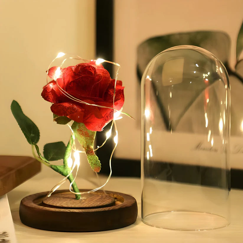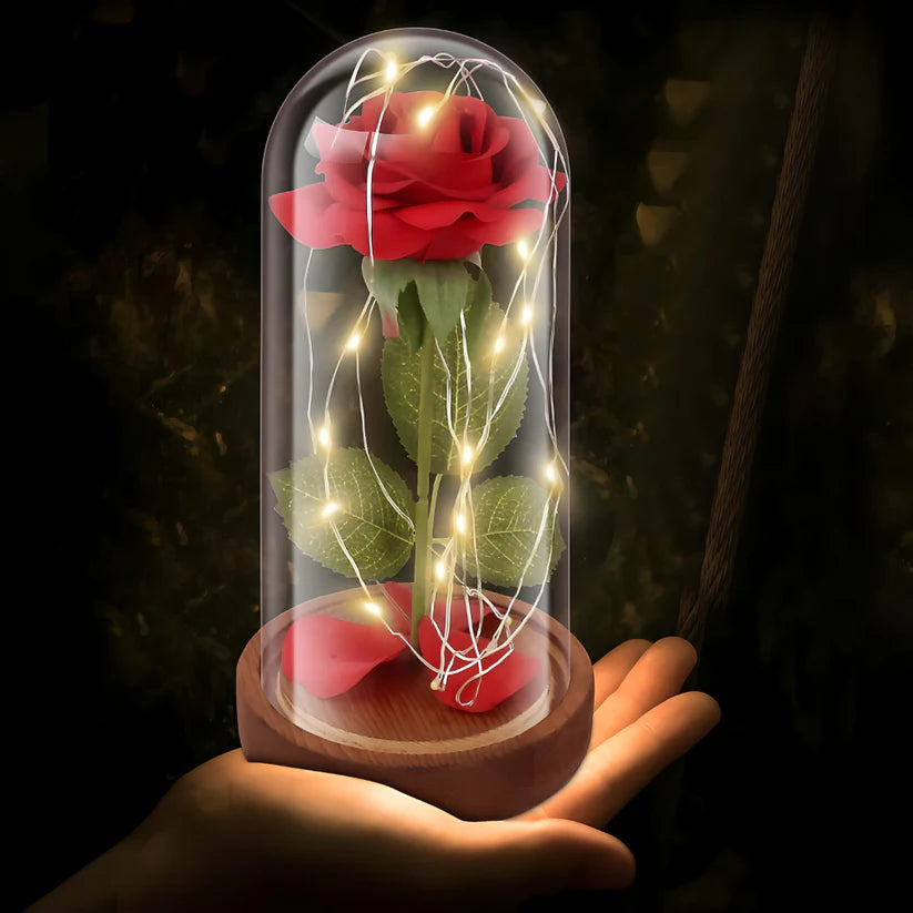 Elegantna dekoracija i poklon koji simbolizuje večnu ljubav i pažnju. Ruža je smeštena u stakleni kupolasti okvir i obasjana LED svetlima koja stvaraju romantičnu atmosferu. Idealan poklon za Osmi mart, godišnjicu ili bilo koji poseban trenutak.